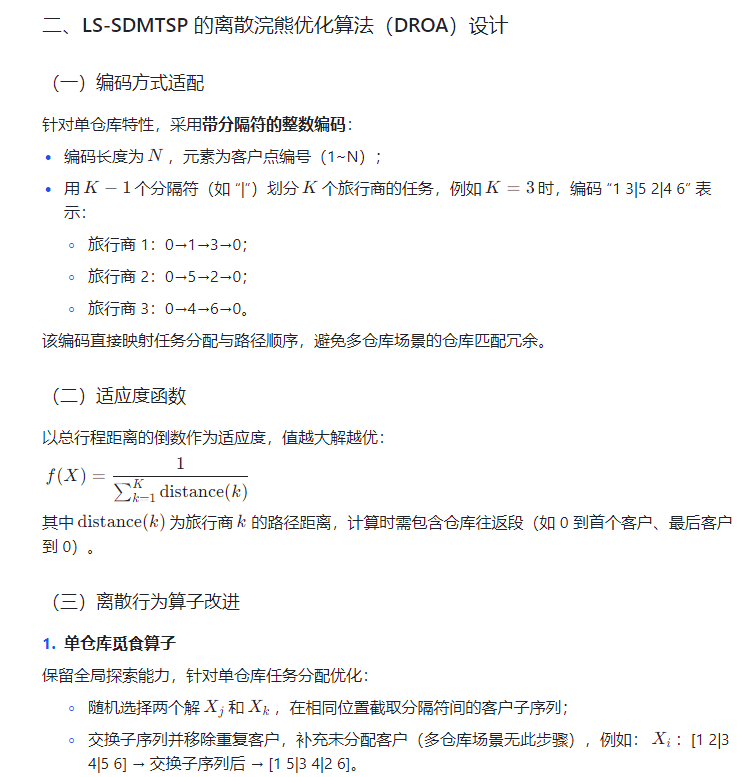 大规模单仓库多旅行商问题(Large-Scale Single-Depot Multi-Traveling Salesman Problem, LS-SDMTSP)是物流配送、智能仓储等领域的核心优化问题。与多仓库场景相比,其特点是所有旅行商从同一仓库出发,协同覆盖数百至数千个客户点后返回仓库,目标是最小化总行程距离。由于客户规模庞大且旅行商任务分配与路径规划高度耦合,传统算法难以高效求解。离散浣熊优化算法(Discrete Raccoon Optimization Algorithm, DROA) 凭借对组合优化问题的强适配性,通过模拟浣熊觅食、攀爬与缓存行为,在全局探索与局部开发间实现动态平衡,为 LS-SDMTSP 提供了高效解决方案。本文将针对 LS-SDMTSP 的特性改进 DROA,设计专用编码与算子,构建求解框架并验证其性能。