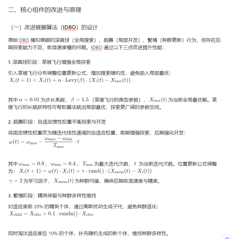 在工业过程监控、能源负荷预测、环境参数反演等领域,多变量回归任务需从高维度、强耦合、非平稳的时序数据中挖掘变量间的动态关联,进而实现对目标变量的精准预测。传统回归模型(如 XGBoost、SVR)难以同时捕捉多变量的长程时序依赖与局部非线性关联,而单一深度学习模型(如 TCN、BiGRU)在特征提取的全面性或参数优化效率上存在局限。改进蜣螂算法(Improved Dung Beetle Optimization, IDBO)通过优化搜索策略提升全局寻优能力,为 TCN-BiGRU 混合模型的超参数优化提供高效解决方案。本文将系统构建 IDBO-TCN-BiGRU 多变量回归模型,解析其改进机制、融合架构与预测性能。