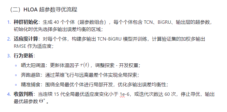 在环境监测、工业过程控制、能源系统调度等实际场景中,多输出回归任务需同时预测多个关联目标变量(如同时预测温度、湿度、PM2.5 浓度,或反应釜温度、压力、产品纯度),其核心在于挖掘输入变量与多目标变量间的复杂时空关联,同时平衡多个输出的预测精度。传统多输出模型(如多输出 XGBoost、多输出 SVR)难以捕捉长程时序依赖与变量间的非线性耦合;单一深度学习模型(如多输出 TCN、多输出 BiGRU)虽能建模时序特征,但超参数优化效率低,且易偏向误差较小的输出变量,导致多目标预测失衡。2022 年提出的角蜥蜴优化算法(Horned Lizard Optimization Algorithm, HLOA),模拟角蜥蜴 “晒太阳调温 - 奔跑避敌 - 精准捕食” 的行为机制,具备强全局寻优与均衡优化能力,为多输出 TCN-BiGRU 模型的超参数优化提供理想方案。本文将构建 HLOA-TCN-BiGRU 多输出回归模型,系统解析其优化机制、多输出适配架构与预测性能。