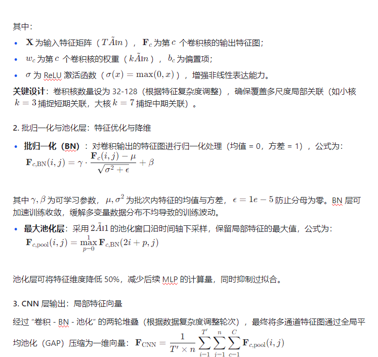 在工业参数预测、环境指标反演、能源负荷估算等领域,多输入单输出(MISO)的多变量回归任务极为常见 —— 例如通过温度、压力、进料速率等多个工艺参数预测化工产品纯度,或依据光照强度、风速、湿度等环境变量预测光伏电站出力。这类任务的核心挑战在于:多输入变量间存在复杂的局部关联(如相邻时段的光照与温度耦合),且输入与输出间呈现强非线性映射关系。传统多层感知机(MLP)虽能拟合非线性关系,但对变量间的局部时空关联捕捉能力不足;单一卷积网络(CNN)擅长提取局部特征,却难以处理全局非线性映射。本文提出CNN-MLP 混合模型,通过 CNN 提取多变量的局部关联特征,MLP 完成特征到单输出的非线性回归,形成 “局部特征提取 - 全局非线性拟合” 的二级架构,为多输入单输出多变量回归任务提供高效解决方案。
