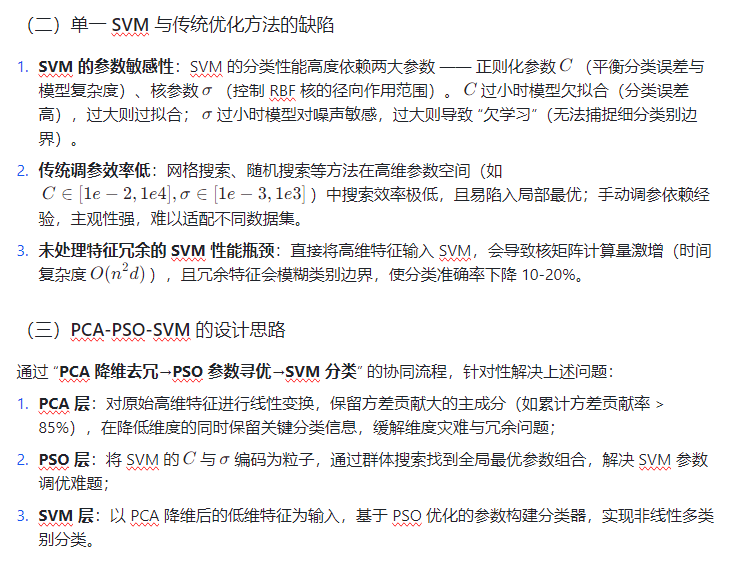 需精准匹配),手动调参难以兼顾分类精度与泛化能力。主成分分析(PCA)可通过降维保留关键特征、剔除冗余信息;粒子群算法(PSO)能高效搜索 SVM 的最优参数组合。本文构建PCA-PSO-SVM 多特征分类模型,形成 “降维去冗 - 智能寻优 - 非线性分类” 的三级架构,为高维多特征分类任务提供高效解决方案。
