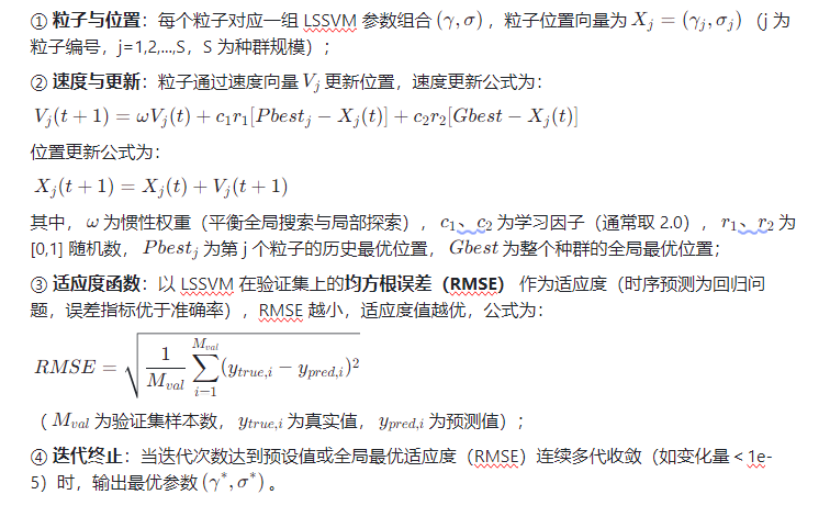 为解决上述问题,PSO-LSSVM 融合模型应运而生:以 LSSVM 为核心实现非线性时序回归,通过粒子群算法(PSO)高效搜索 LSSVM 最优参数,同时结合时序数据预处理(平稳化、滑动窗口采样),构建高精度、高稳定性的单变量时序预测模型。