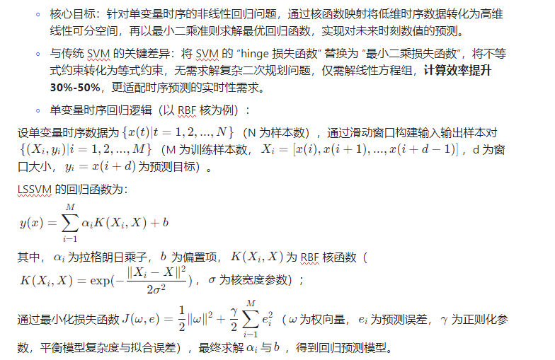 - 参数优化效率低:最小二乘向量机(LSSVM)作为 SVM 的改进算法,虽通过最小二乘损失简化计算、提升非线性拟合能力,但其预测性能高度依赖正则化参数(γ) 与核函数参数(如 RBF 核的 σ) —— 传统网格搜索、梯度下降法易陷入局部最优,且对单变量时序的 “时间关联性” 适配不足;