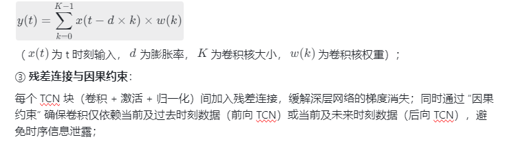 区别于传统卷积的 “连续采样”,膨胀卷积通过 “间隔采样” 扩大感受野(如 dilation=2 时,卷积核每隔 1 个时间步采样 1 个点),无需增加参数即可捕捉长距离局部特征(如处理 1000 时间步数据时,dilation=8 可覆盖 256 个时间步的局部关联),公式为: