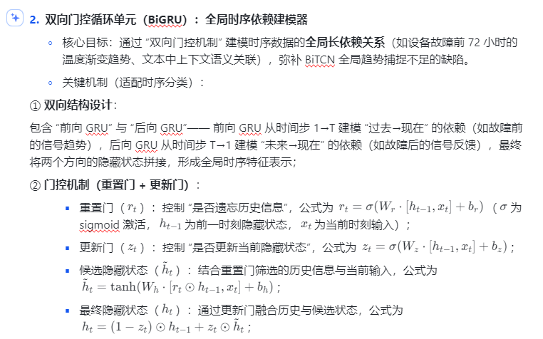 - 双向门控循环单元(BiGRU)虽能建模前后向时序依赖,但对局部细粒度特征(如设备振动信号的瞬时峰值、心电信号的 QRS 波群)捕捉能力弱,且处理长时序数据(如 1000 + 时间步)时易出现 “梯度弥散”;