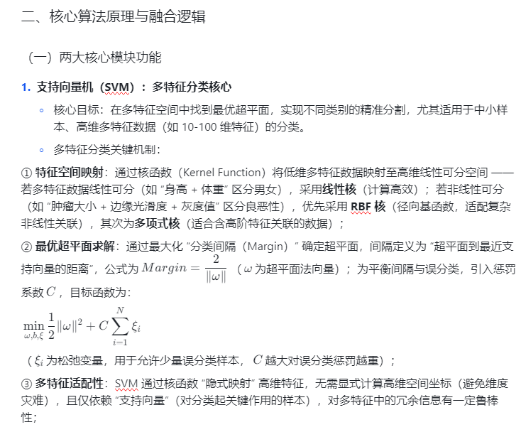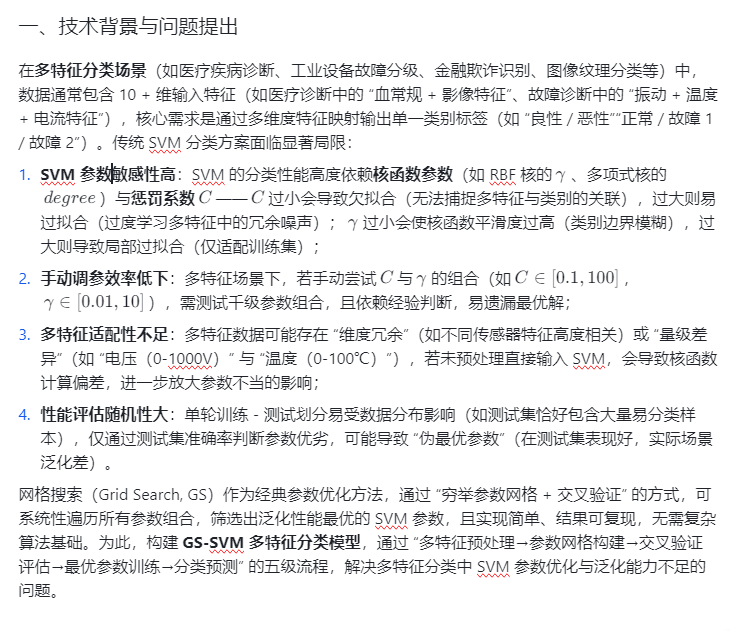 在多特征分类场景(如医疗疾病诊断、工业设备故障分级、金融欺诈识别、图像纹理分类等)中,数据通常包含 10 + 维输入特征(如医疗诊断中的 “血常规 + 影像特征”、故障诊断中的 “振动 + 温度 + 电流特征”),核心需求是通过多维度特征映射输出单一类别标签(如 “良性 / 恶性”“正常 / 故障 1 / 故障 2”)。传统 SVM 分类方案面临显著局限: