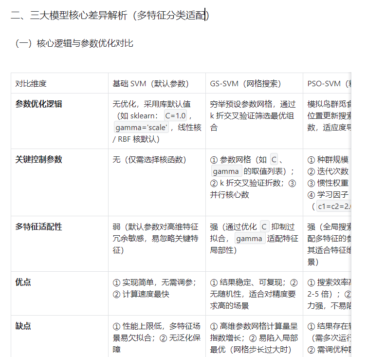- PSO-SVM(粒子群优化):全局搜索效率高,较 GS 减少 50%+ 计算量,但受种群规模、迭代次数影响,结果随机性略高于 GS。