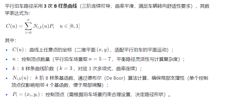B 样条曲线(B-Spline Curve)作为 “分段多项式曲线”,具备任意阶连续可导、局部调整性强、曲率可控的核心优势 —— 通过调整控制顶点即可灵活生成满足车辆运动约束的平滑路径,且能快速适配车位尺寸变化,成为解决平行泊车路径规划痛点的理想方案。其核心价值在于:路径曲率连续变化(避免转向突变)、可通过控制顶点精准约束泊车终点姿态(车身与车位平行,偏差≤2°)、局部调整性(修改单个控制顶点仅影响局部路径,动态场景响应快)。
