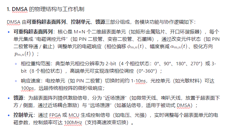 要构建通信模型,需先明确 DMSA 的物理结构与电磁重构机制,这是模型设计的基础 —— 其核心优势源于 “超表面单元的动态电磁调控能力”,而非传统天线的 “阵元信号叠加”。