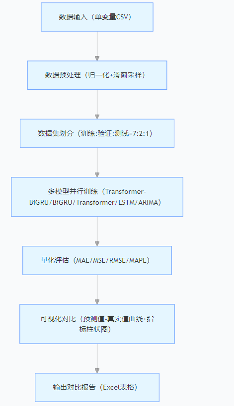 本文提供一套 “一键式” 对比方案,整合数据预处理→多模型训练→量化评估→可视化对比全流程,支持 Transformer-BiGRU 与 BiGRU、Transformer、LSTM、ARIMA(传统模型)的自动对比,用户仅需修改数据路径即可快速验证混合模型的优势,适用于科研对比与工程落地。