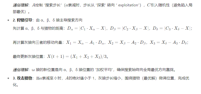 GWO 由 Mirjalili 于 2014 年提出,核心是模拟灰狼群体的 “狩猎行为”—— 通过 “alpha 狼(α,全局最优解)、beta 狼(β,次优解)、delta 狼(δ,第三优解)” 引导 “omega 狼(ω,普通搜索个体)” 在参数空间中搜索,最终逼近全局最优。