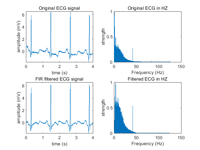 :设计 200 阶 FIR 带通滤波器(1.2~49Hz),去除 ECG 信号中的基线漂移(<1Hz)和工频干扰(50Hz),并对比滤波前后的时频域差异;