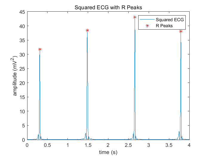 :通过 “信号绝对值平方→峰值检测” 定位 R 波,计算 R-R 间期、心率;
