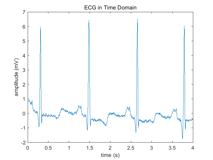 :绘制原始 ECG 的时域波形(前 4 秒)和频域幅度谱;
