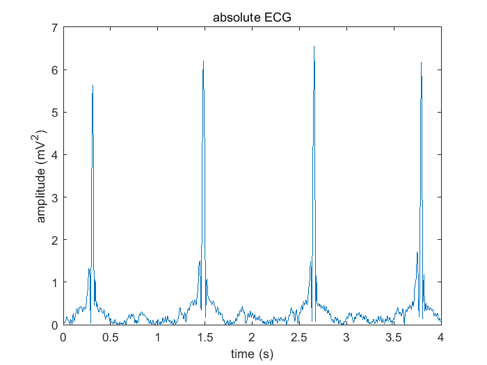 :ECG 中 QRS 波(含 R 波)是幅值最大的成分,通过 “绝对值 + 平方” 进一步放大其幅值优势,降低 P 波、T 波的干扰;