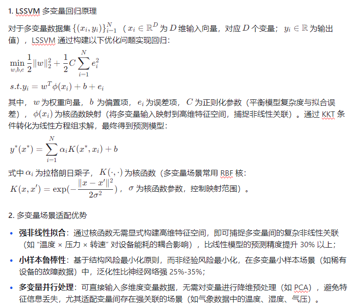 最小二乘支持向量机(LSSVM)是传统支持向量机(SVM)的改进版,通过将 “不等式约束” 转化为 “等式约束”,简化求解复杂度,同时保留 SVM 的核函数优势,能有效处理多变量间的复杂非线性关系。