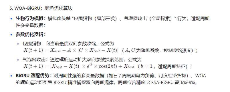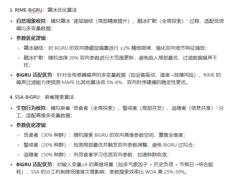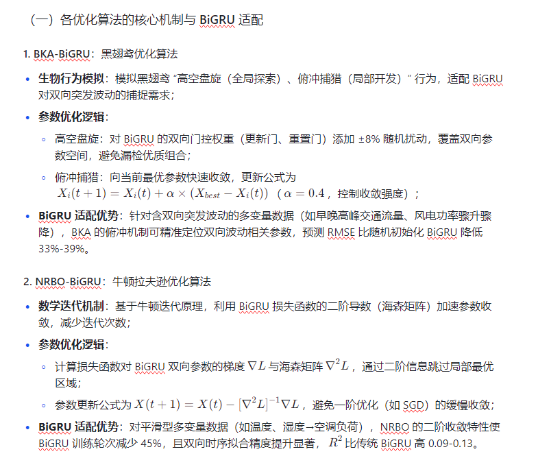 各优化算法通过独特寻优机制,优化 BiGRU 的关键参数(双向门控权重、偏置、学习率),解决 BiGRU 的参数痛点。核心差异体现在 “双向特征捕捉适配性”“高维参数寻优效率”“噪声鲁棒性” 三方面,适配不同多变量时序数据特性,且均基于 BiGRU 双向架构,确保对比公平性。