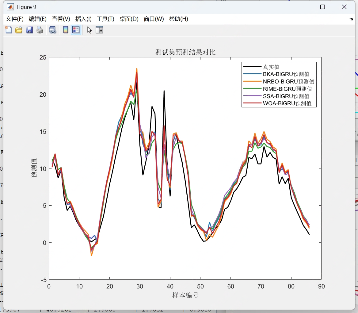 在能源负荷、环境监测、金融走势等多变量时序预测场景中,BiGRU(双向门控循环单元)凭借双向时序建模能力,比单向 LSTM 更精准捕捉 “历史 - 未来” 双向依赖关系,但随机初始化权重 / 偏置易导致模型陷入局部最优。黑翅鸢优化(BKA)、牛顿拉夫逊(NRBO)、霜冰优化(RIME)、麻雀搜索(SSA)、鲸鱼优化(WOA)五种算法,从不同维度提供全局寻优能力。本文构建 “5 种优化算法 + BiGRU” 的多变量时序预测模型,设计 “一键对比” 框架,通过统一数据、统一指标、自动化流程,高效验证各模型的预测精度与稳定性,为场景化选型提供科学依据。