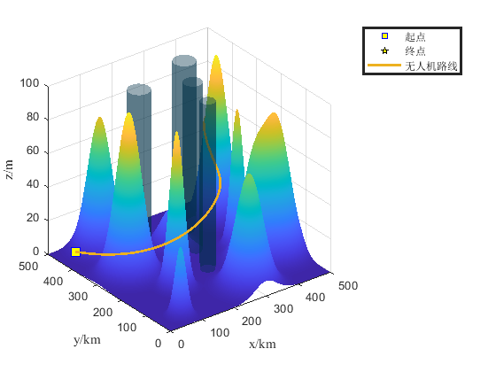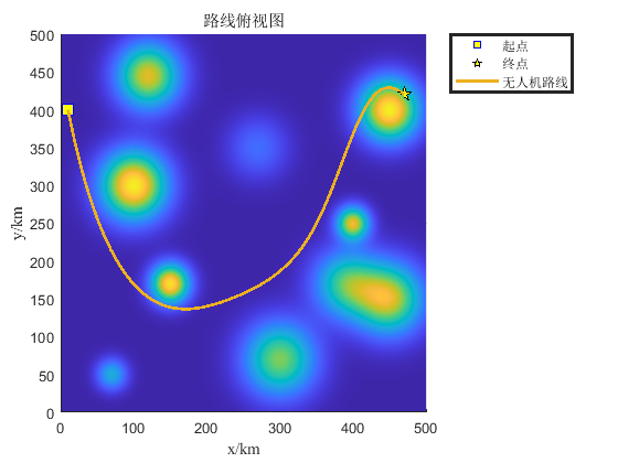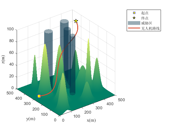 无人机集群协同航迹规划通过规划集群的最优航迹,协调多种类型的多架无人机,在同一时刻到达目标,提高无人机的整体突防能力,实现饱和攻击。粒子群算法在适应性、可扩展性、全局寻优和并行处理等方面展现出了卓越的性能,因而被广泛应用于路径规划研究领域。本项目采用改进粒子群算法对无人机集群协同航迹进行规划,最后通过仿真实验验证算法的可行性和有效性。 通过动态粒子群算法对单架无人机三个威胁区进行了单轨迹仿真和五架无人机三个威胁区的协同航迹规划进行了仿真。结果表明,可以规划出无人机航迹并且成功避开威胁区,协同航迹能够同时到达目标区域对敌进行打击。