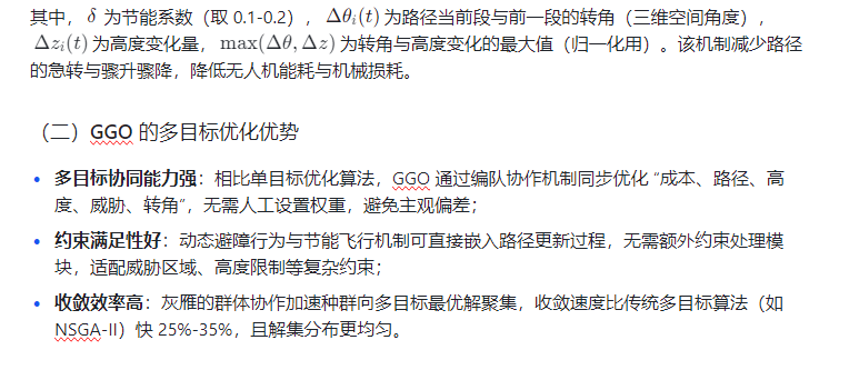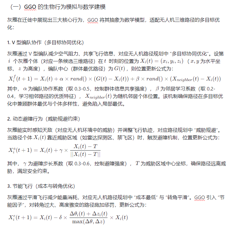 GGO 算法灵感源于灰雁在长距离迁徙中的群体智慧,其 “编队协作、动态避障、节能飞行” 特性与无人机三维路径规划的多目标需求高度契合,能有效解决多目标优化中的 “探索 - 利用平衡” 与 “约束满足” 难题。