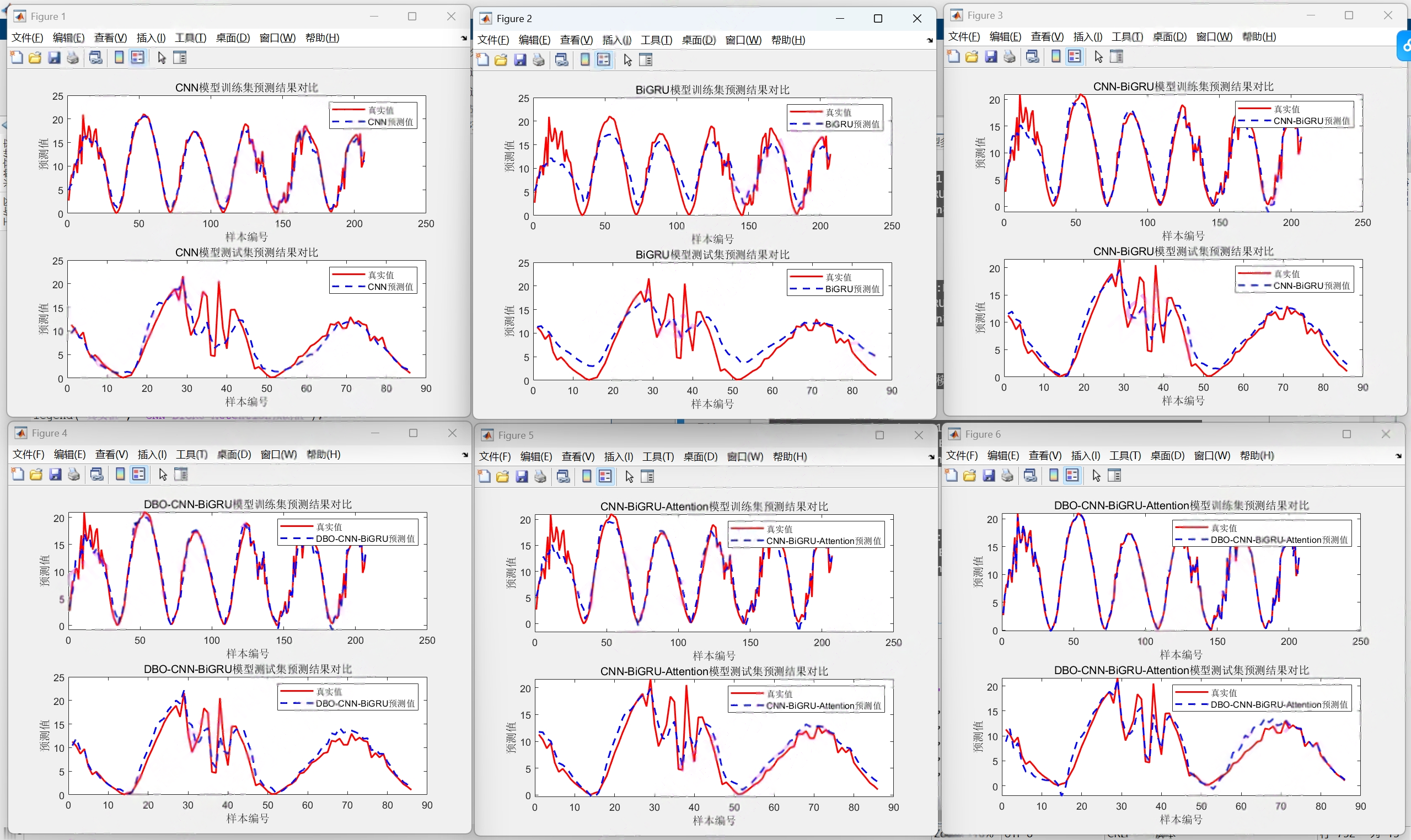 在多变量时序预测领域(如多站点气象预测、多设备能耗预测),DBO-CNN-GRU-Attention 6 模型通过 “深度信念优化(DBO)+ 卷积特征提取(CNN)+ 时序建模(GRU)+ 注意力机制(Attention)” 的融合架构,实现对复杂时序依赖与关键特征的精准捕捉。然而,各模块对模型性能的贡献度、多输出与单输出场景下的模块适配性尚未明确。本文通过消融实验,逐一验证 DBO 优化、CNN、GRU、Attention 模块的核心作用,设计 “一键对比” 框架,在多输出(如未来 3 步温度 + 湿度预测)与单输出(如未来 1 步电力负荷预测)场景下,量化分析各消融模型的性能差异,为模型架构优化与场景化选型提供科学依据。