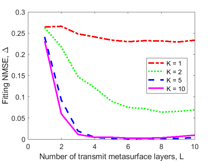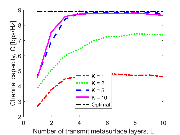 xlabel('Number of transmit metasurface layers, L');