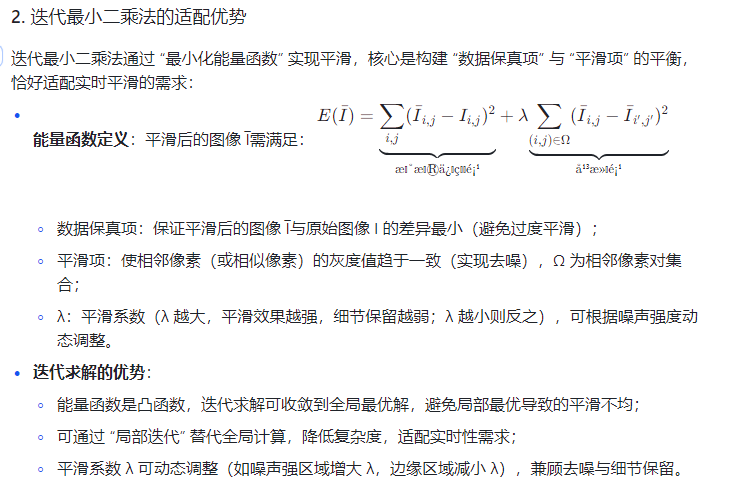 要理解迭代最小二乘法的价值,需先明确实时场景下图像平滑的核心矛盾:“去噪效果” 与 “实时性”“细节保留” 的平衡。