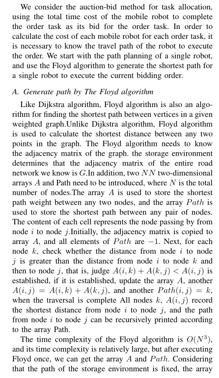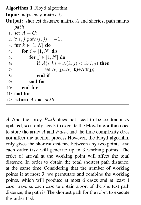- 步骤 1:基础时间计算:基于 Floyd 算法预计算仓库内所有关键节点(货位、分拣台、通道交叉点)之间的最短路径长度 L,结合机器人当前速度 v(空载 v₀=1.2m/s,满载 v₁=0.8m/s),得到基础时间 T_base = L /v;