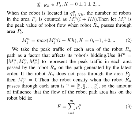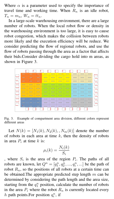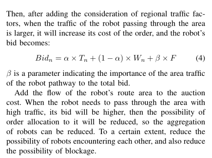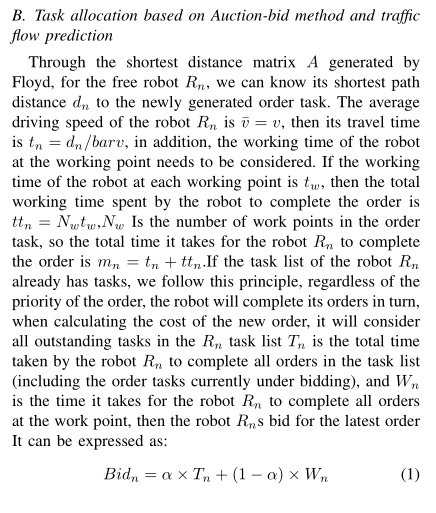 - 地图密度因子 β:实时感知任务路径沿线的机器人密度 ρ(如 ρ=2 台 /m,即每米通道有 2 台机器人),β=1 + 0.3ρ(密度越高,避让时间越长),若路径拥堵,β 增大,Bid Time 增加。