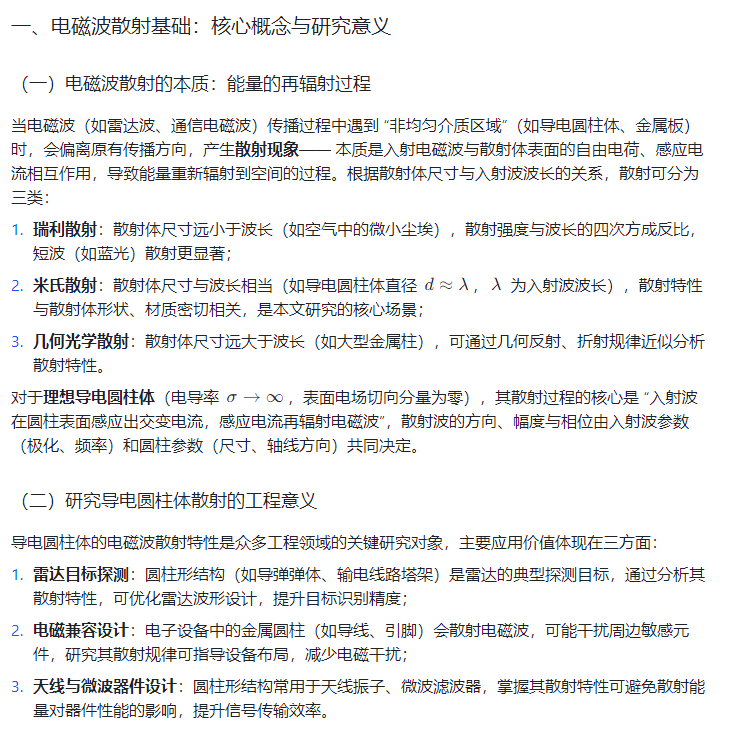在电磁学与电磁波工程领域,导电圆柱体是一种极具代表性的规则散射体,广泛存在于天线设计、雷达目标探测、电磁兼容(EMC)测试等场景中 —— 小到通信设备中的金属引脚,大到雷达监测的圆柱形飞行器部件,其电磁波散射特性直接影响系统性能。深入理解导电圆柱体的电磁波散射规律,不仅能为实际工程问题提供理论支撑,更能为复杂目标的散射特性分析奠定基础。本文将从电磁波散射基础、导电圆柱体散射原理、数学建模、极化特性及应用场景五方面,全面解析这一经典电磁问题。