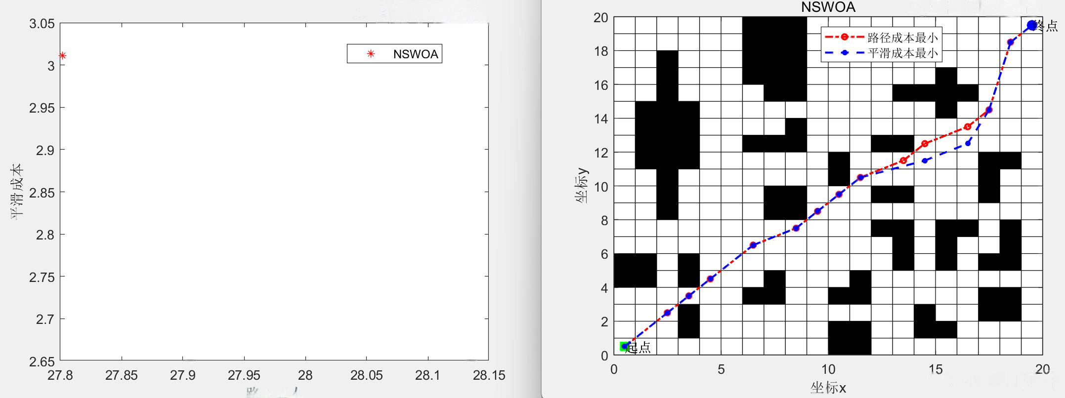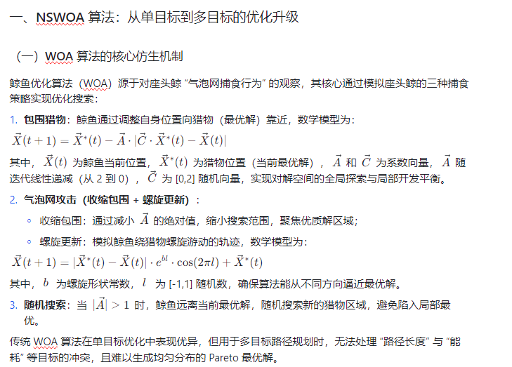 在智能制造、仓储物流、服务机器人等领域,移动机器人的路径规划需同时兼顾 “路径最短”“能耗最低”“避障安全”“运动平滑” 等多重目标,传统单目标优化算法难以平衡相互冲突的需求。鲸鱼优化算法(Whale Optimization Algorithm,WOA)虽因仿生机制简单、搜索能力强被广泛应用,但在多目标优化场景中存在 “解的多样性不足”“收敛精度有限” 等问题。而非支配排序鲸鱼优化算法(Non-Dominated Sorting Whale Optimization Algorithm,NSWOA) 通过引入非支配排序机制与精英保留策略,将单目标 WOA 扩展为多目标优化算法,能在复杂环境中高效输出 Pareto 最优解集,为移动机器人路径规划提供了创新解决方案。本文将从 NSWOA 算法原理、路径规划多目标模型、算法实现流程及实验验证四方面,全面解析这一优化方案。
