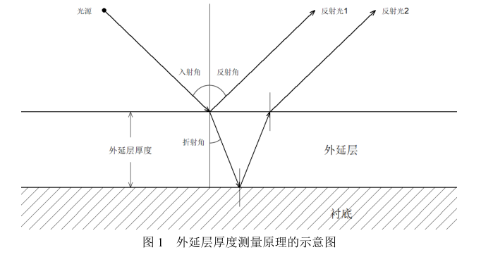 红外干涉法是外延层厚度测量的无损伤测量方法,其工作原理是,外延层与衬底因掺杂载流子浓度的不同而有不同的折射率,红外光入射到外延层后,一部分从外延层表面反射出来,另一部分从衬底表面反射回来(图 1),这两束光在一定条件下会产生干涉条纹。可根据红外光谱的波长、外延层的折射率和红外光的入射角等参数确定外延层的厚度。通常外延层的折射率不是常数,它与掺杂载流子的浓度、红外光谱的波长等参数有关。