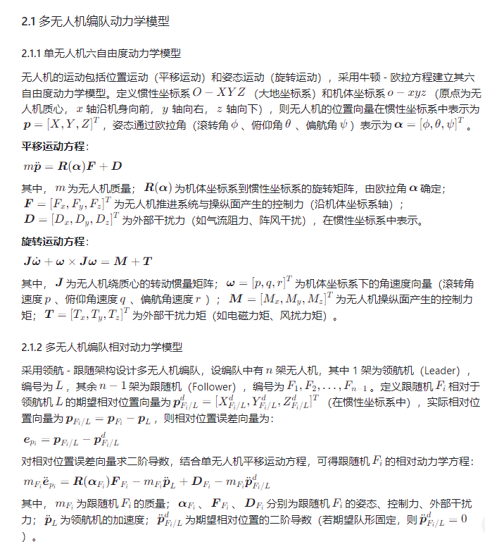 - 动力学建模方法:采用牛顿 - 欧拉方程建立单无人机的六自由度动力学模型,基于领航 - 跟随架构建立多无人机编队的相对动力学模型,结合风洞实验数据与电磁干扰测试数据,构建外部干扰模型;