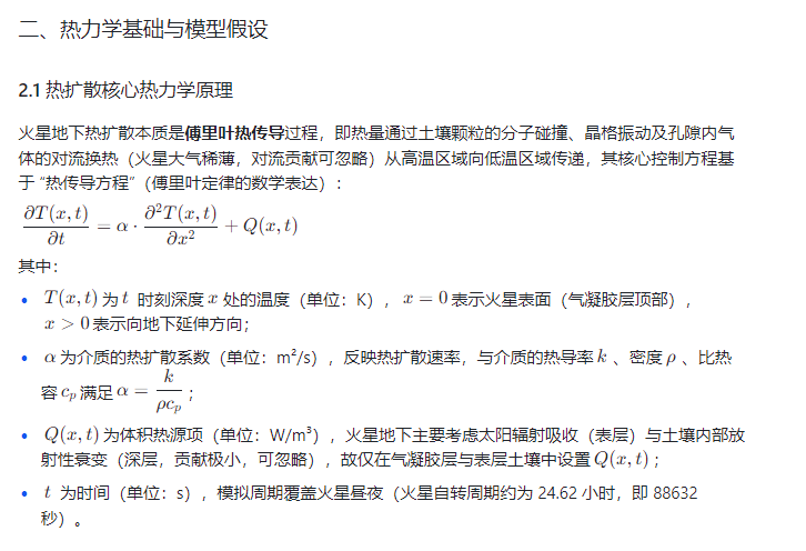 本文基于热力学热传导理论,构建 “二氧化硅气凝胶层 - 火星地下土壤” 的一维热扩散模型,通过数值模拟分析气凝胶层厚度、孔隙率、太阳辐射强度等参数对地下温度场分布与热扩散速率的影响,为火星表面热控系统设计、地下探测设备部署提供理论支撑。