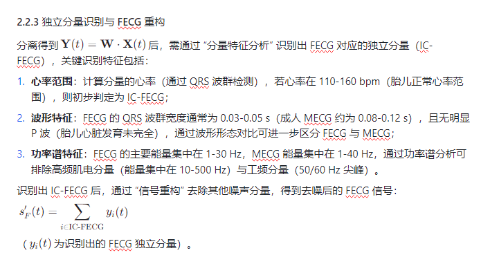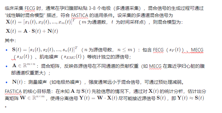 传统噪声消除方法(如滤波、自适应噪声抵消)存在 “易丢失 FECG 细节”“对 MECG 抑制不彻底” 等缺陷。快速独立分量分析(Fast Independent Component Analysis,FASTICA)作为一种盲源分离(BSS)算法,可在 “未知源信号分布、未知混合过程” 的情况下,从多通道混合信号中分离出统计独立的源信号,尤其适用于 MECG 与 FECG 的分离 —— 通过 FASTICA 可将腹部多通道采集的混合信号(含 FECG、MECG、肌电、工频等)分解为独立分量,再通过分量识别与重构实现 FECG 的噪声消除,为后续胎儿心率计算、心律失常诊断提供高质量信号。