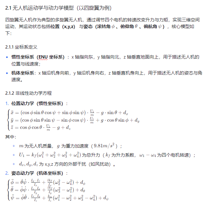 无人机(Unmanned Aerial Vehicle, UAV)在航拍测绘、物流配送、电力巡检、应急救援等领域的广泛应用,对其控制性能提出了更高要求 —— 需实现姿态稳定(如滚转、俯仰、偏航角精准控制)、位置跟踪(如按预设轨迹飞行)、抗干扰能力(如抵御风扰动)三大核心目标。传统 PID 控制虽结构简单、易于实现,但在多变量耦合(如无人机姿态与位置相互影响)、非线性动态(如高速飞行时空气动力学特性变化)场景下,难以兼顾控制精度与稳定性。