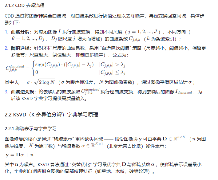 CDD(Curvelet Domain Denoising,曲波域去噪)算法凭借曲波变换对图像边缘、纹理等几何结构的优异表征能力,可有效保留图像细节信息;KSVD(K-Singular Value Decomposition,K 奇异值分解)算法通过自适应学习图像块的稀疏字典,能精准拟合图像的局部纹理特征。将 CDD 与 KSVD 结合形成的CDD-KSVD 算法,可先通过 CDD 抑制修复过程中的噪声干扰,再利用 KSVD 字典学习实现缺失区域的纹理重构,尤其适用于 “对象去除” 这类大面积缺失的图像修复场景。