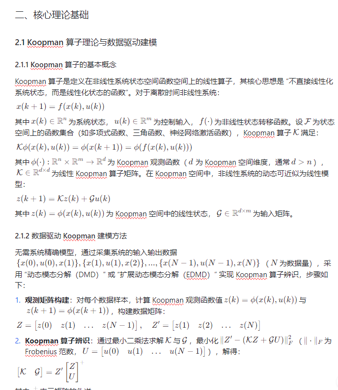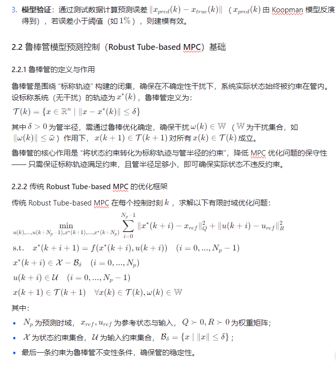 Koopman 算子理论为非线性系统的线性化描述提供了新路径 —— 通过将非线性系统映射到高维线性 Koopman 空间,可在该空间中用线性模型近似非线性动态,且无需依赖系统的精确数学模型,仅通过输入输出数据即可实现数据驱动建模。鲁棒管模型预测控制(Robust Tube-based MPC)则通过构建 “鲁棒管”(Tube),确保系统状态在不确定性干扰下始终被约束在管内,平衡鲁棒性与控制性能。