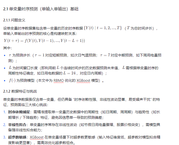 单变量时序预测(Univariate Time Series Prediction, UTSP)是时序分析领域的基础且关键任务,旨在仅利用单一变量的历史时序数据(如日用电量、日气温、股票收盘价),预测该变量未来时刻的取值(单输入单输出,SISO),广泛应用于居民用电调度、农业气象预报、金融风险预警等场景。传统单变量时序预测方法存在明显局限:ARIMA 模型仅适用于线性时序数据,难以捕捉非线性波动;LSTM 模型虽能处理非线性问题,但对数据量要求高、超参数调优复杂且训练耗时;传统 XGBoost 模型虽具备非线性拟合能力,但其预测精度高度依赖超参数组合,而网格搜索、随机搜索等传统超参数优化方法存在 “搜索效率低、易陷入局部最优” 的问题,无法充分发挥 XGBoost 的性能优势。
