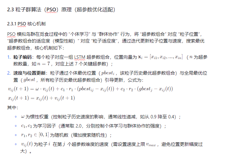 粒子群算法(Particle Swarm Optimization, PSO)作为模拟鸟群觅食行为的智能优化算法,具有 “全局寻优能力强、收敛速度快、参数设置简单” 的优势。将 PSO 用于 LSTM 超参数优化,可高效搜索最优超参数组合,解决传统优化方法的痛点,充分发挥 LSTM 对多变量时序数据的拟合能力。本文提出的 PSO-LSTM 模型,为多变量时序预测提供 “高精度、高效率、强鲁棒性” 的解决方案,对提升工程场景中复杂时序预测任务的可靠性与实用性具有重要意义