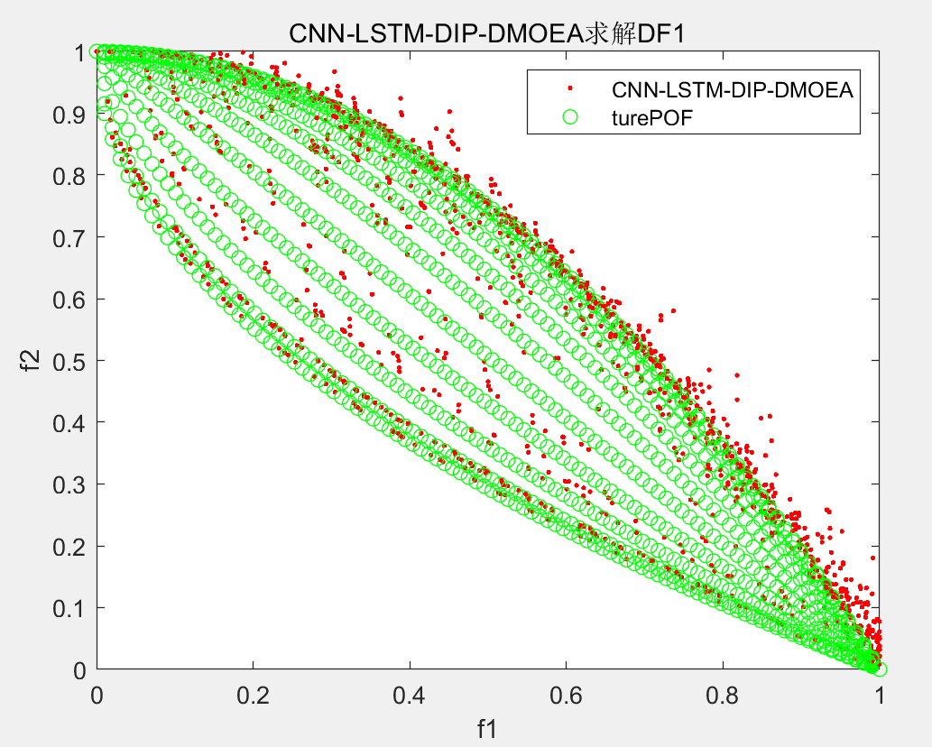 基于 CNN-LSTM 定向改进预测的动态多目标进化算法(CNN-LSTM-DIP-DMOEA)应运而生,它是基于定向改进预测的动态多目标进化算法(DIP-DMOEA)的创新性改进版本。该算法的核心在于将 DIP-DMOEA 中用于学习动态多目标优化问题中环境变化的 BP 神经网络,升级为融合了卷积神经网络(CNN)强大的特征提取能力和长短期记忆网络(LSTM)处理时间序列能力的 CNN-LSTM 网络。CNN 能够从输入数据中敏锐地抽取局部的空间特征,无论是图像中的边缘、纹理,还是自然语言处理中词语之间的组合模式等都能精准捕捉;LSTM 则如同一位记忆力超强的助手,能够接收由前一层传递过来的信息,并长时间维持状态更新,有效捕捉长时间跨度上的动态变化规律。通过这种巧妙的结合,CNN-LSTM 能够更出色地学习动态多目标优化问题中环境的复杂变化规律,克服传统预测策略在面对非线性等复杂变化模式时的局限性。同时,依据神经网络学习到的环境变化模式,定向改进预测(DIP)在决策空间中确定有希望的搜索方向,生成的初始种群具有更优的收敛性和多样性,使算法在求解不同动态多目标优化问题时更加高效。