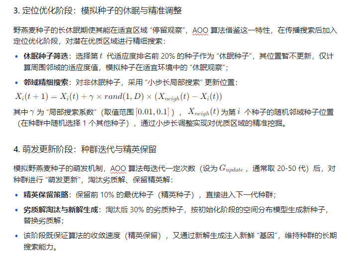 AOO 算法通过抽象野燕麦种子的自然行为,构建了 “种群初始化 - 传播搜索 - 定位优化 - 萌发更新” 的迭代流程,每个阶段均对应明确的数学模型,确保算法的可解释性与可操作性。