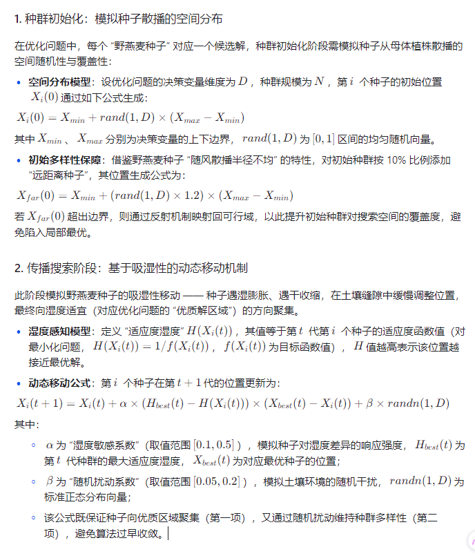 这种 “被动适应与主动探索结合” 的生存策略,成为 AOO 算法的核心设计灵感。传统元启发式算法(如粒子群优化、遗传算法)多模拟生物群体的协作行为,而 AOO 算法创新地聚焦于单一物种的 “个体 - 环境交互” 机制,通过模拟野燕麦种子的传播、定位、萌发三个关键阶段,实现对复杂优化问题的高效求解,为高维、多约束优化场景提供了新的解决思路。