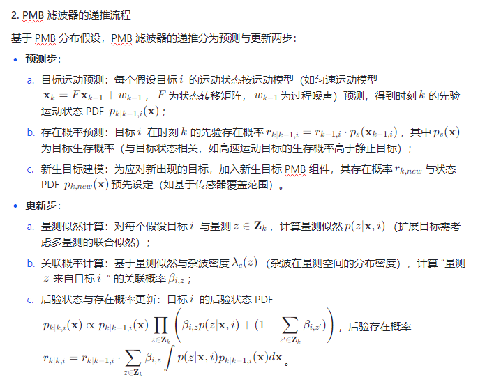 针对上述局限,概率多假设(PMB)与概率多伯努利混合(PMBM)滤波器凭借对 “目标数量时变”“多量测关联” 的高效建模能力,成为杂波扩展目标跟踪的主流方法,下文将详细分析两种滤波器的核心机制与杂波适应策略。