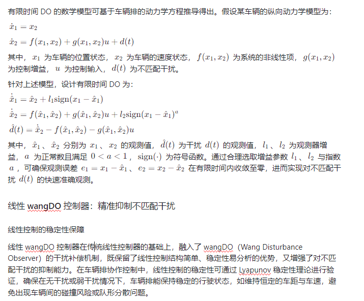 然而,车辆排运行过程中面临着多种干扰挑战,其中不匹配干扰(如路面摩擦力突变、侧风干扰、车辆自身参数摄动等)对控制性能的影响尤为显著。这类干扰无法通过传统的反馈控制直接抵消,易导致车辆排的队形紊乱、车速波动,甚至引发安全隐患。传统的车辆控制方法在应对不匹配干扰时,往往存在响应速度慢、抗干扰能力有限等问题,难以满足复杂交通环境下的控制需求。因此,研发能有效抑制不匹配干扰的车辆排协作控制策略,成为当前智能交通领域的重要研究方向。而基于有限时间扰动观测器(DO)与线性 wangDO 控制器的协作控制方案,为解决这一难题提供了新的思路。