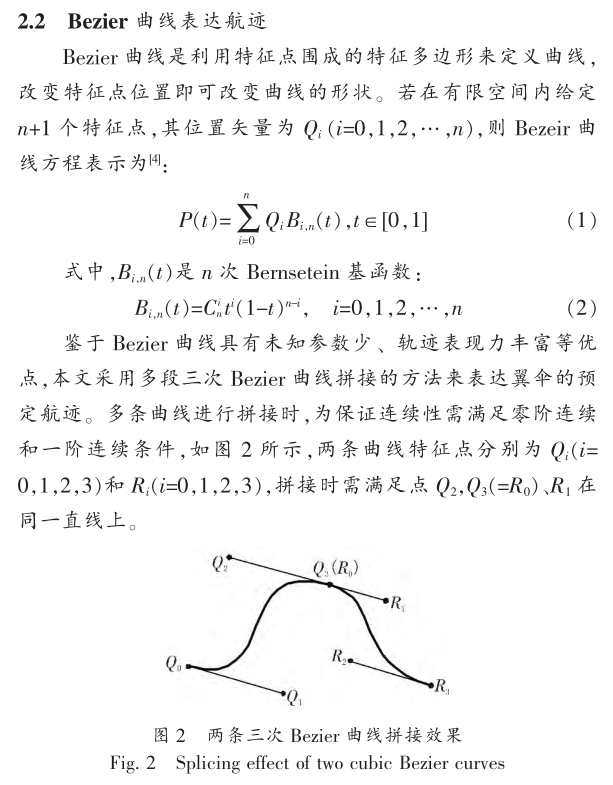 Bezier 曲线凭借其参数化特性,可通过少量控制点灵活调整曲线形态,生成无拐点的平滑路径,天然适配翼伞的连续飞行需求;粒子群优化(PSO)算法作为一种群体智能优化方法,具有收敛速度快、实现难度低的优势,但标准 PSO 在处理高维度、多约束的风环境航迹规划问题时,易出现早熟收敛、局部最优解陷阱等缺陷。因此,本文提出将 Bezier 曲线用于航迹建模,结合改进 PSO 算法优化控制点参数,构建一套适用于风环境的翼伞航迹规划方案,旨在提升翼伞在动态风场中的航迹精度与抗干扰能力,为实际任务提供技术支撑。