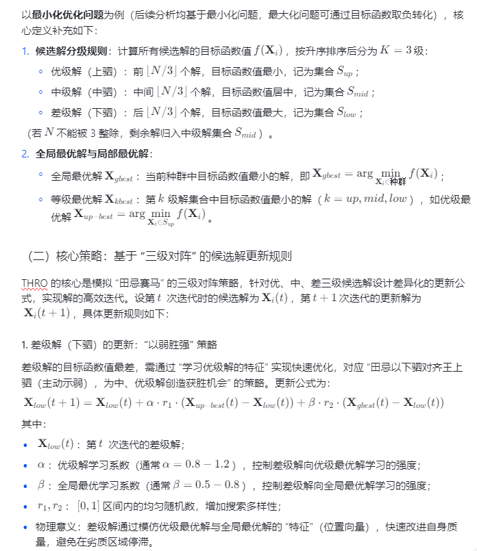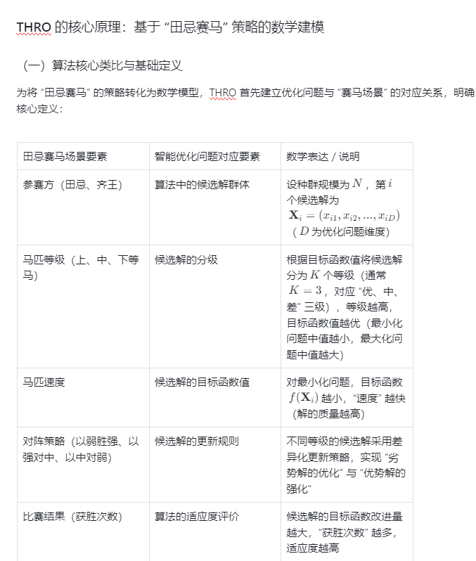 基于此,田忌赛马优化算法(Tianji Horse Racing Optimization, THRO)应运而生。其核心创新是将优化问题中的 “候选解” 类比为 “赛马”,“解的目标函数值” 类比为 “马匹速度”,通过模拟 “田忌赛马” 的 “分级对阵”“动态调整”“策略迭代” 过程,实现候选解的高效更新与全局最优解的精准搜索。相较于传统算法,THRO 在多峰函数优化、高维问题求解、复杂约束场景中展现出更强的全局寻优能力与更快的收敛速度,为智能优化领域提供了一种源于东方智慧的新型解决方案。