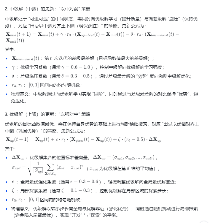 传统元启发式算法在处理高维、多峰、复杂约束优化问题时,常面临 “局部最优陷阱”“收敛速度失衡”“解的多样性不足” 三大痛点:例如,粒子群算法(PSO)在迭代后期易因群体多样性丧失陷入局部最优,遗传算法(GA)虽能保持多样性,但收敛速度较慢,在高维函数优化中迭代次数常需数千次。而 “田忌赛马” 策略的核心优势在于:通过 “局部劣势的合理取舍” 实现 “全局优势的最大化”,这一思想恰好能解决传统算法中 “探索(全局搜索)” 与 “开发(局部优化)” 的平衡难题。