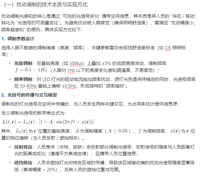 基于扰动调制光感知的占用率分布估计技术,为解决上述难题提供了创新路径。其核心思想是:将灯光自身作为 “感知载体”,通过对灯光信号施加微小扰动(如亮度、频率的低频调制),利用接收端(如光敏传感器)采集经人员反射 / 遮挡后的扰动光信号,结合智能优化算法反演空间占用率分布。该技术无需额外部署感知设备(复用灯光系统)、无隐私风险、成本低,且能与灯光投送策略深度耦合,实现 “感知 - 优化 - 投送” 的闭环控制,为智能灯光系统赋予 “自感知、自优化” 的能力。