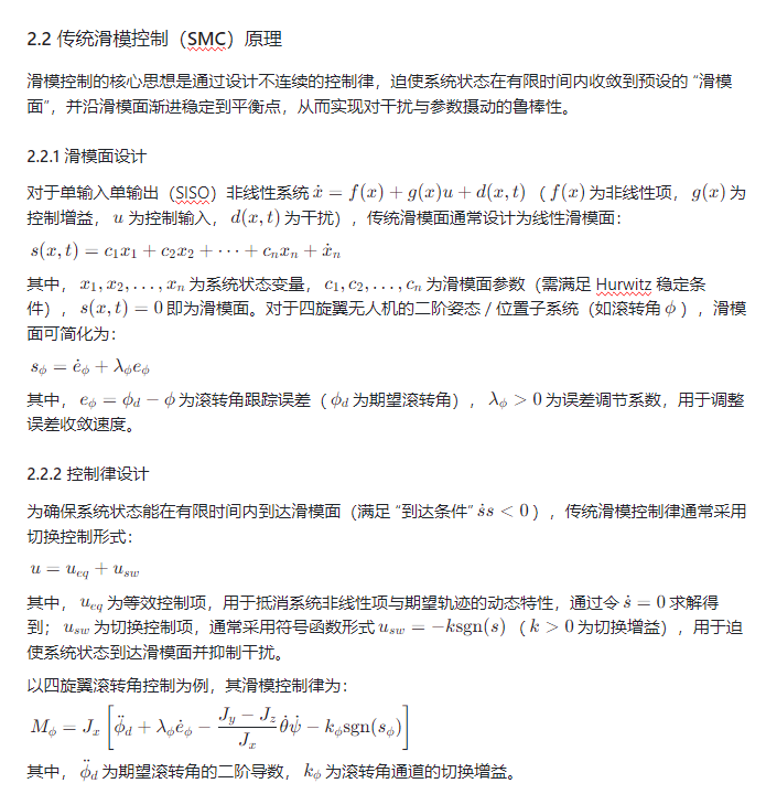 滑模控制(Sliding Mode Control,SMC)作为一种非线性鲁棒控制方法,具有不依赖精确系统模型、对参数摄动与外部干扰不敏感的优势,天然适配四旋翼无人机的控制需求。但传统滑模控制存在 “抖振问题”—— 控制信号的高频切换会导致电机输出频繁波动,加速执行器磨损,同时影响无人机飞行平稳性。因此,本文提出基于改进滑模控制的四旋翼无人机控制策略:通过设计新型滑模面、引入扰动观测器与自适应增益调节机制,在保留滑模控制鲁棒性的同时,抑制抖振现象,实现无人机姿态与位置的高精度、稳定控制,为复杂干扰环境下的四旋翼无人机可靠飞行提供技术支撑。